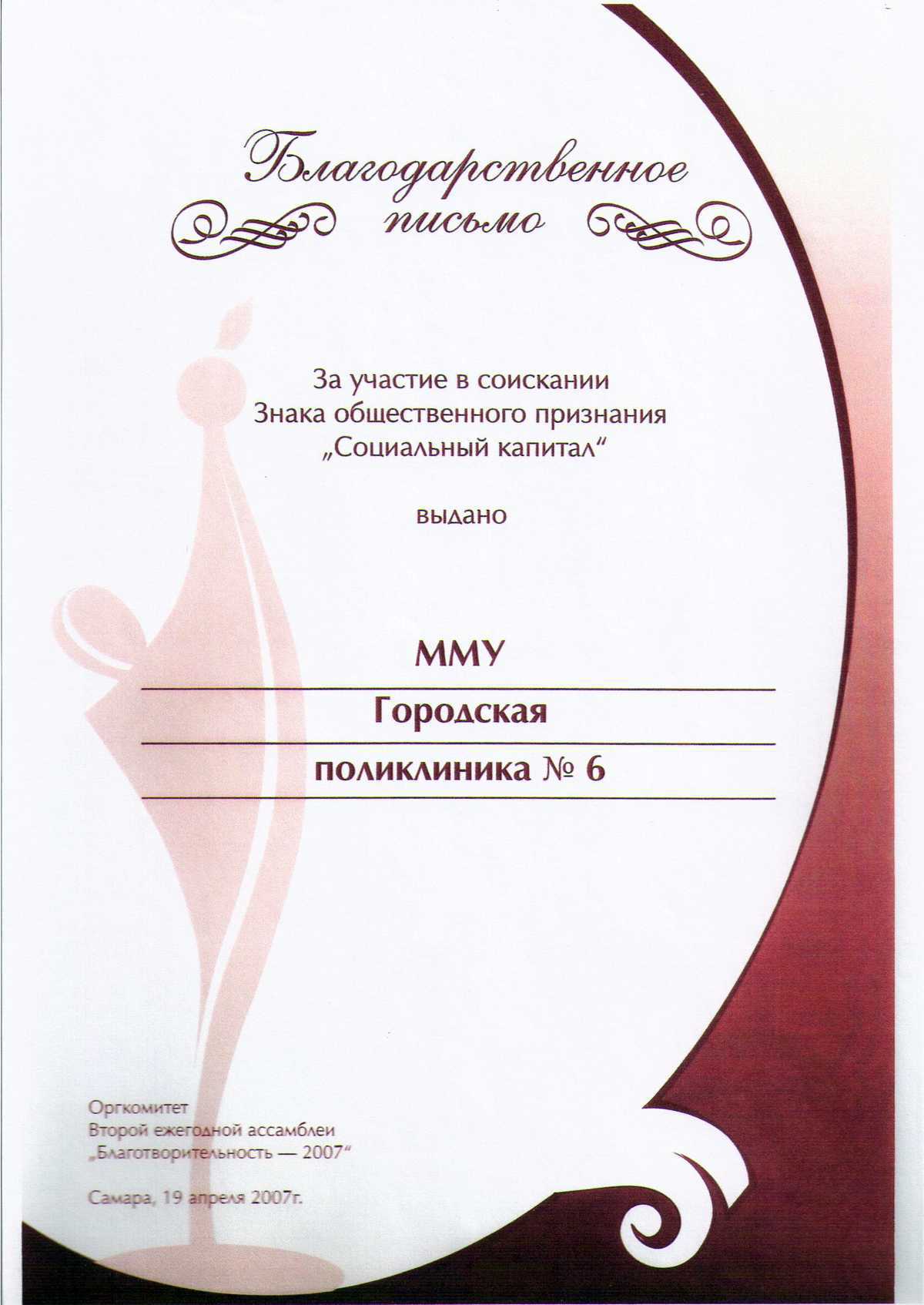 В 2007 году городской поликлинике № 6 за участие во всероссийском проекте «Профессиональная команда страны» объявлена благодарность Самарского регионального отделения партии «Единая Россия»