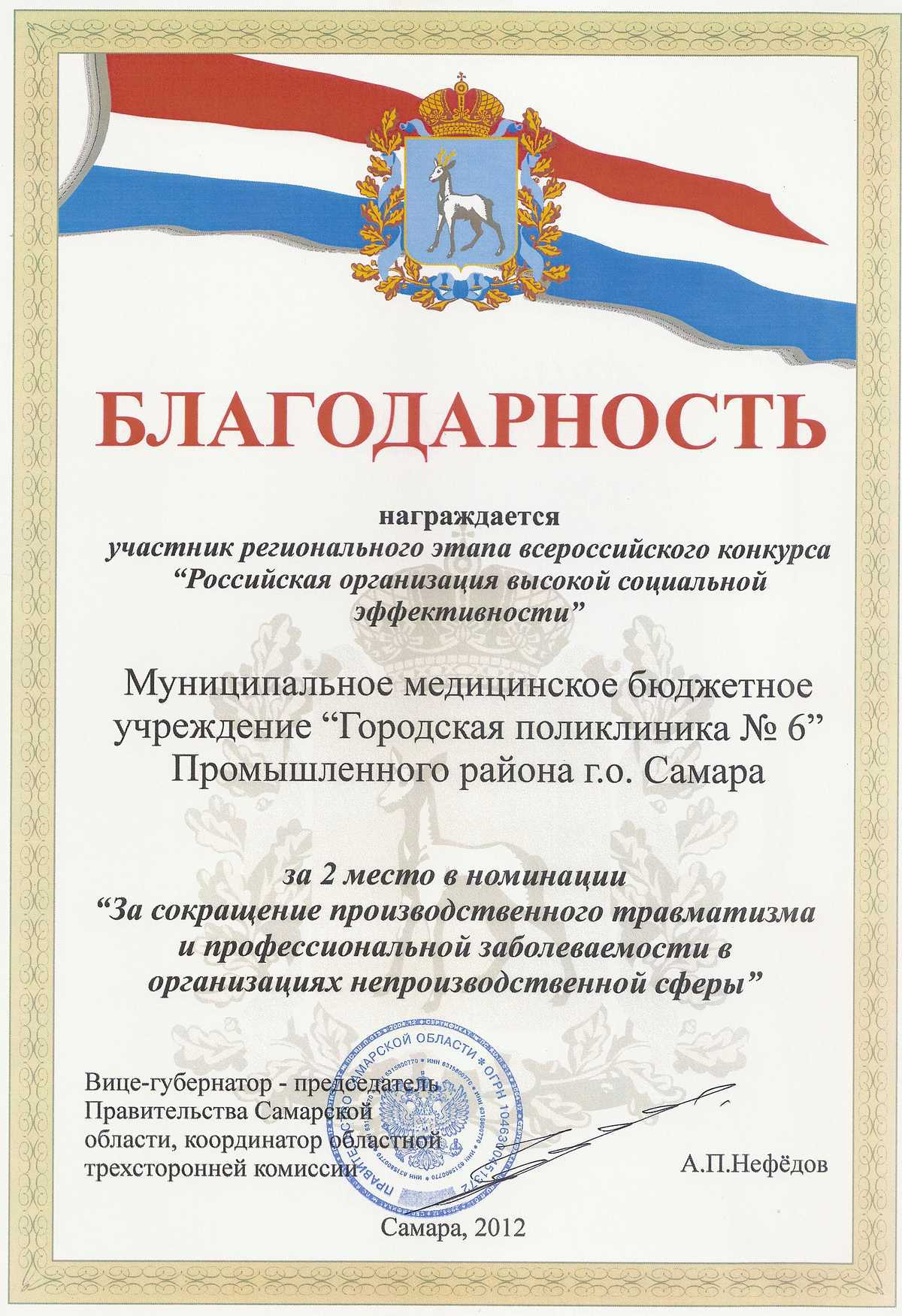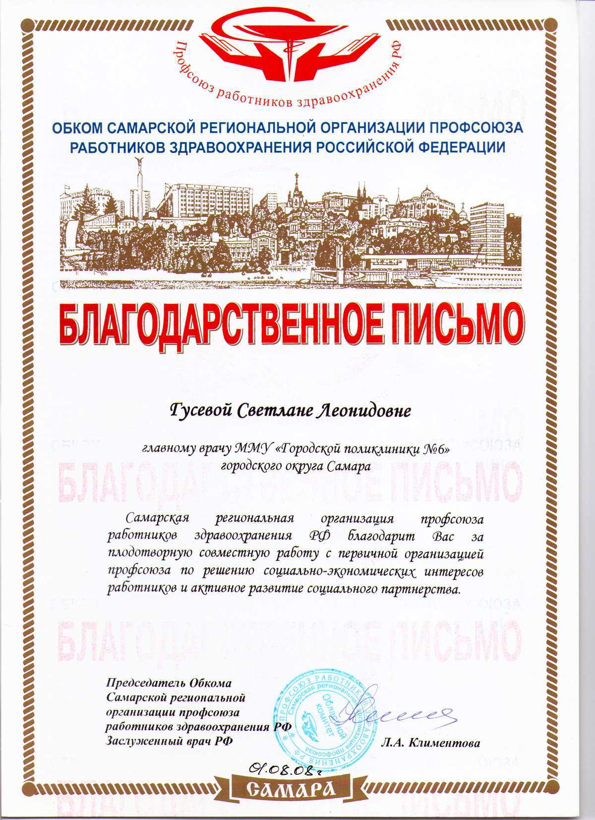 В 2010 году команда городской поликлиники № 6 В 2012 году Федерация профсоюза Самарской области наградила ММБУ ГП № 6 за сотрудничество с Самарской областной организацией профсоюза работников здравоохранения РФ в развитии социального партнерства, направленного на защиту социально-трудовых интересов членов профсоюза